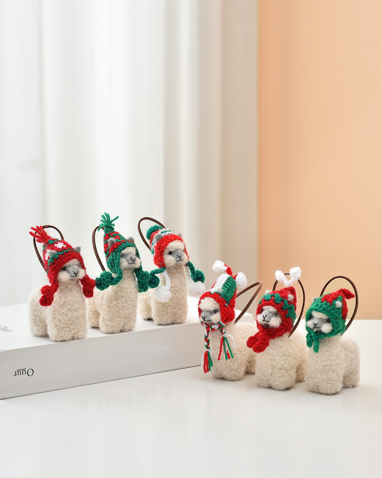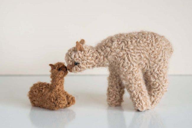 Sweet and loving alpaca mother proudly kissing its little new born baby alpaca figures, hand-crafted with 100% baby alpaca wool by proud female artisans in Peru.